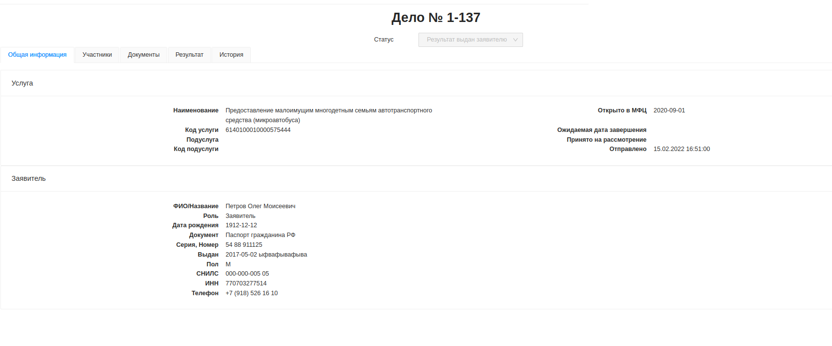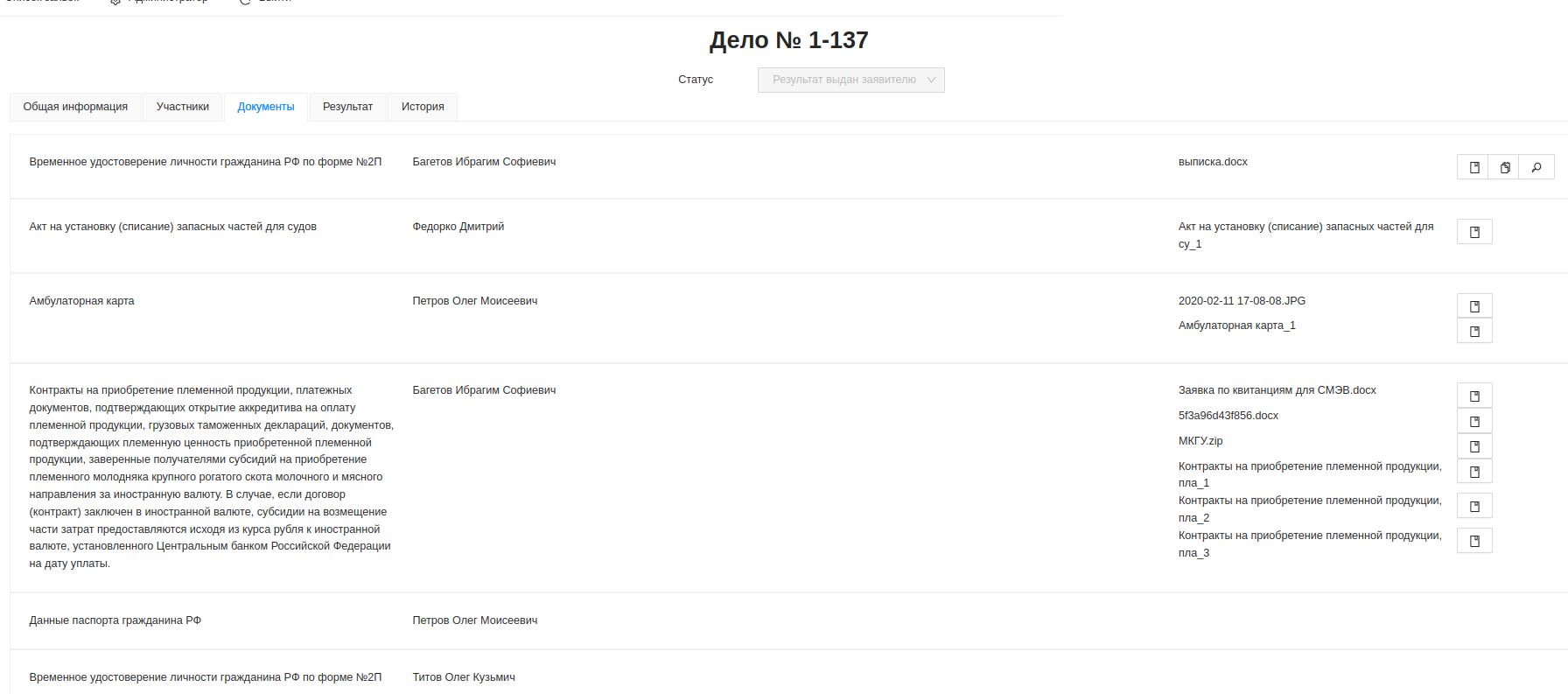 В форме работы с делом можно просмотреть детальную онформацию по делу, просмотреть сканы документов, приложенных к делу, загрузить и подписать ЭЦП результат предоставления услуги, поменять статус дела.