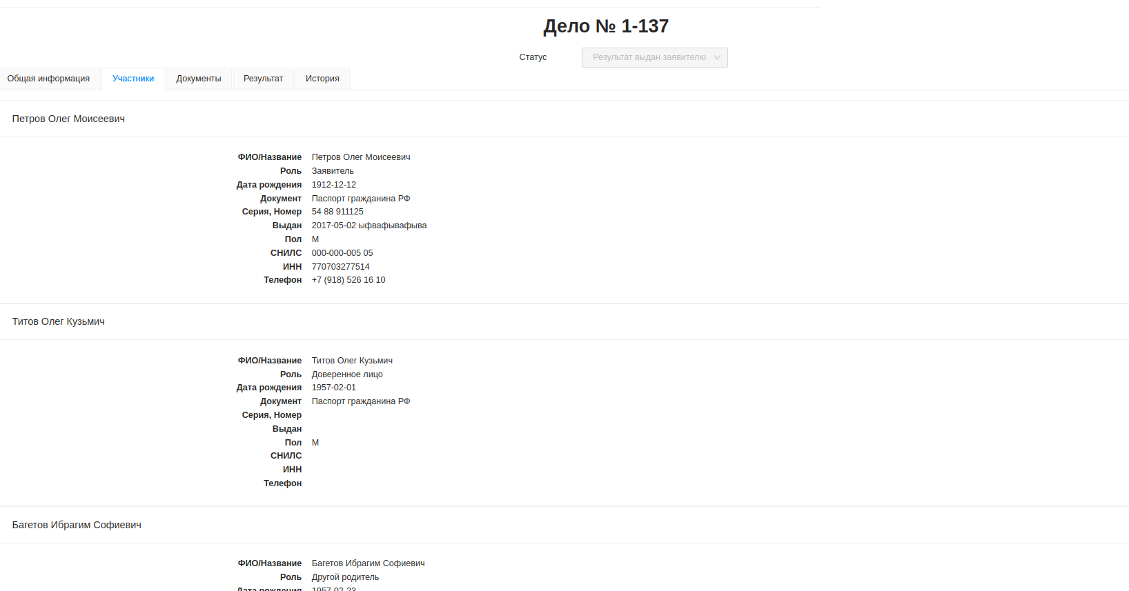 На вкладке "Участники" указан список участников дела(состав семьи, доверенные лица, дольщики и т.п.) с реквизитами каждого из них.