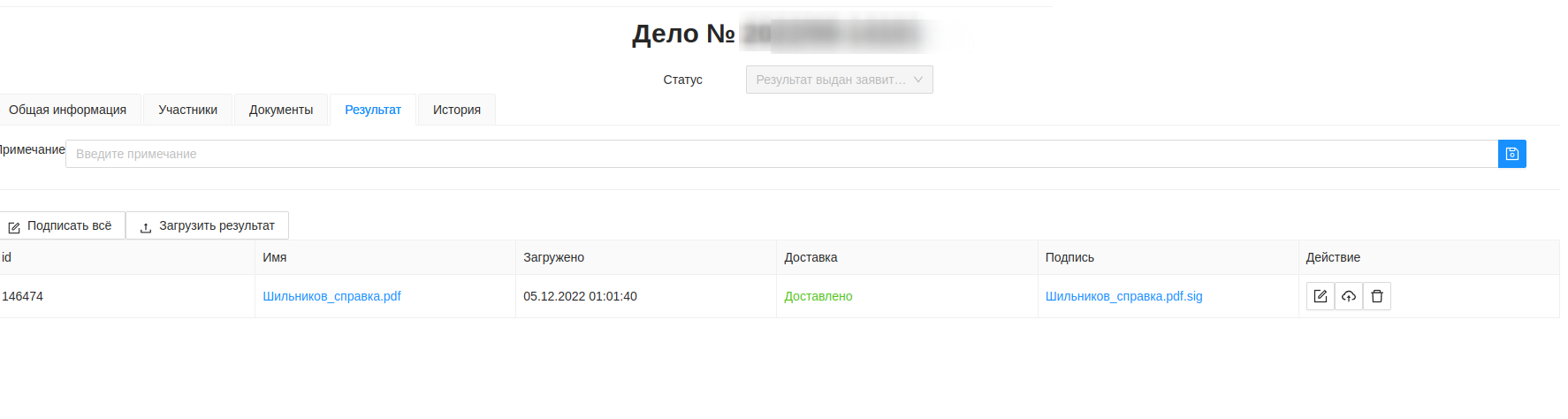 Вкладка "Результат" - это рабочая зона оператора органа власти, здесь он может указать какое-либо примечание к делу(потом по примечанию можно искать в форме "Список заявок"). Также можно загрузить файлы результаты оказания услуги, либо промежуточные файлы. После загрузки файла его можно подписать с помощью ЭЦП и отправить контрагенту. Подписать можно как каждый файл в отдельности так и все загруженные файлы массово.
