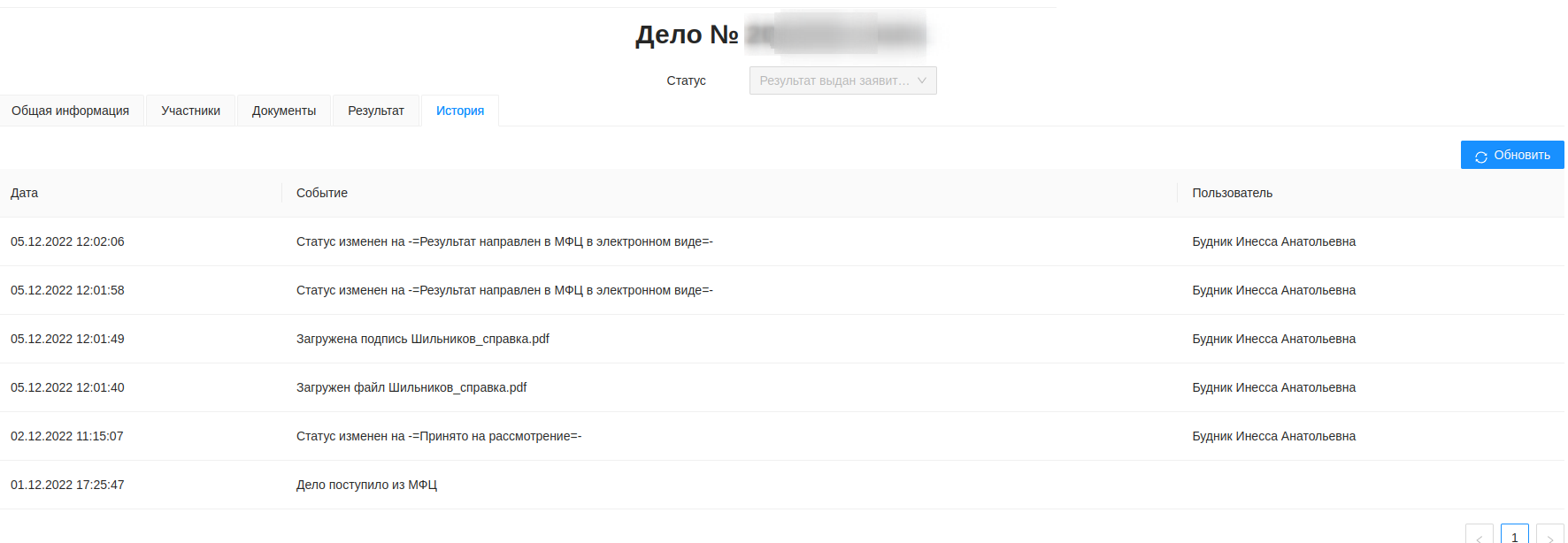 На вкладке "История" можно просмотреть историю изменения статусов дела. События отсортированы в обратном хронологическом порядке(новые сверху)
