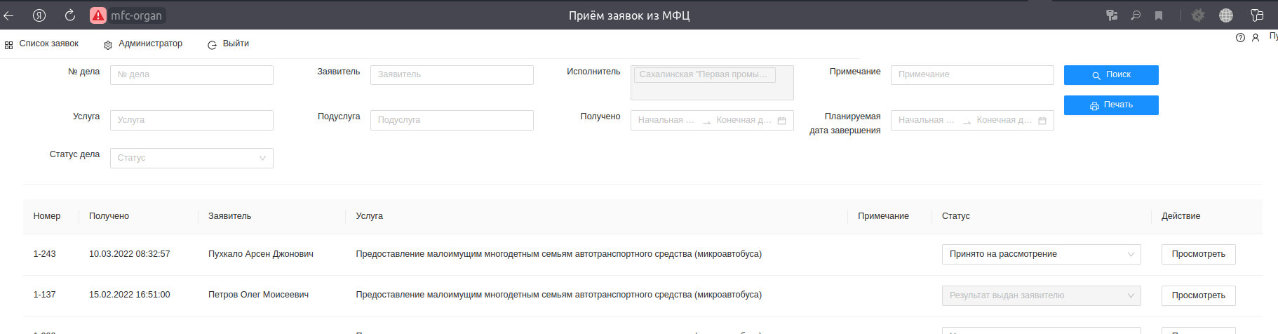 На форме "Список заявок" пользователь может просмотреть список дел направленных в организацию(и) работником которрой он является. На этой форме есть возможность отфильтровать список заявок по услуге, статусу заявки, дате получения в органе, плановой дате исполнения, номеру дела, заявителю а также по значению поля "примечание". У пользователя с правами администратора есть возможность просматривать заявки в разных организациях-исполнителях, обычный же пользователь видит заявки только для своей организации. Пользователь программы может в форме просмотра списка заявок сменить статус заявки или перейти к детальной информации по выбранному делу. Терминальные статусы(результат выдан, результат возвращен) заблокированы для изменения, сменить их может только пользователь с правами администратора. Для просмотра детальной информации по делу нужно на соответствующей строке нажать на кнопку «просмотреть».
