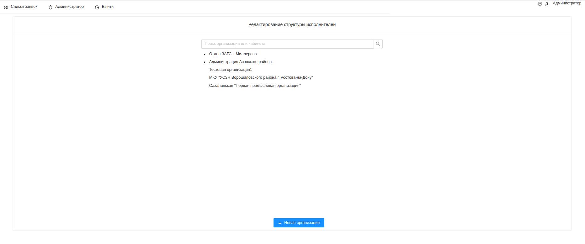 Справочник организаций исполнителоей имеет древовидную структуру, таким образом можно указывать как просто организацию так и структуру каждой организации, её отделы, кабинеты.