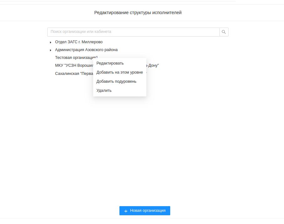 Редактирование организации доступно при двойном щелчке мыши по наименованию. Либо при выборе соответствующего пункта контекстного меню, открывающегося по щелчку правой кнопкой мыши по наименованию. Также в данном меню можно добавить нового исполнителя на том же уровне структуры или на подуровне(подчиненный отдел исполнителя); удалить организацию.