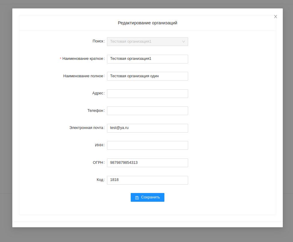 Чтобы добавить организацию необходимо нажать кнопку "Новая организация" и заполнив необходимые поля справочника нажать "Сохранить". Поле код необходимо для определения получателя при импорте дел из внешних систем.